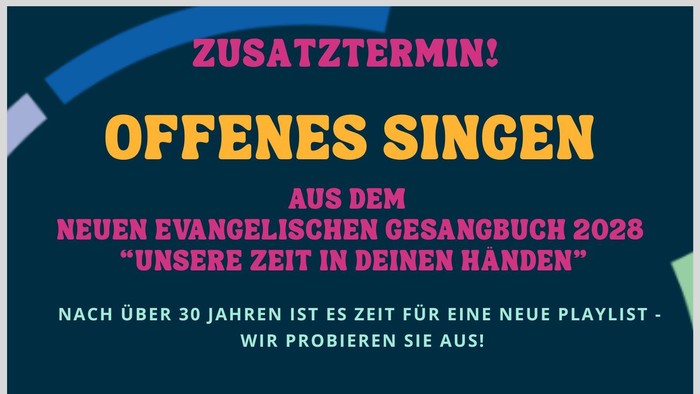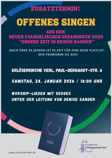 Wie bekannt dürfen wir als Gemeinde die Erprobungsbände zum neuen Evangelischen Gesangbuch auf Herz und Nieren testen. Wir freuen uns, einen weiteren Termin für ein offenes Singen bekannt geben zu dürfen. Denise Sander und die Band 5Edges laden alle interessierten herzlich ein, am Samstag, den 24. Januar 2026 um 16:00 Uhr gemeinsam neue und bekannte Worship-Lieder auszuprobieren! Der Eintritt ist frei, eine Anmeldung ist nicht notwendig.