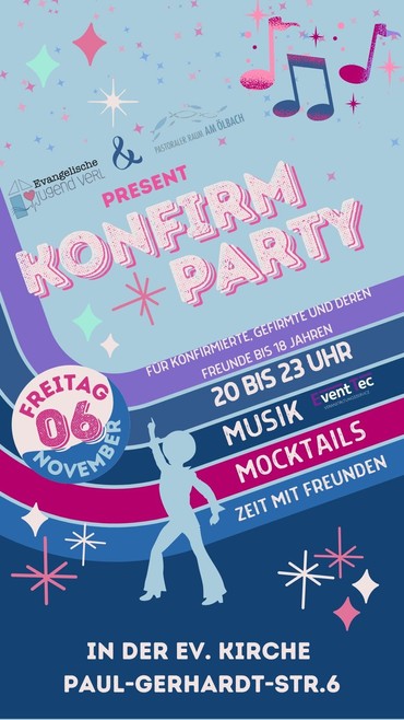 Wir feiern gemeinsam mit der katholischen Gemeinde eine Party für Konfirmierte und Gefrirmte. Alle Jugendliche die aktuell einen Kurs zur Konfirmation oder Firmung besuchen und die, die bereits konfirmiert oder gefirmt sind, bis 18 Jahre, sind herzlich eingeladen bei uns in der evangelischen Kirche mit Ihren Freunden zu feiern. Es git von 20 bis 23 Uhr Musik, Mocktails und eine tolle Zeit. Also kommt vorbei und lasst die Kirche beben.
