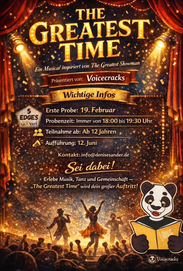 Wir freuen uns sehr über ein neues Projekt: Der Jugendchor Voice Cracks unter der Leitung von Denise Sander startet das Musical „The Greatest Time“, inspiriert vom Erfolgsfilm „The Greatest Showman“.