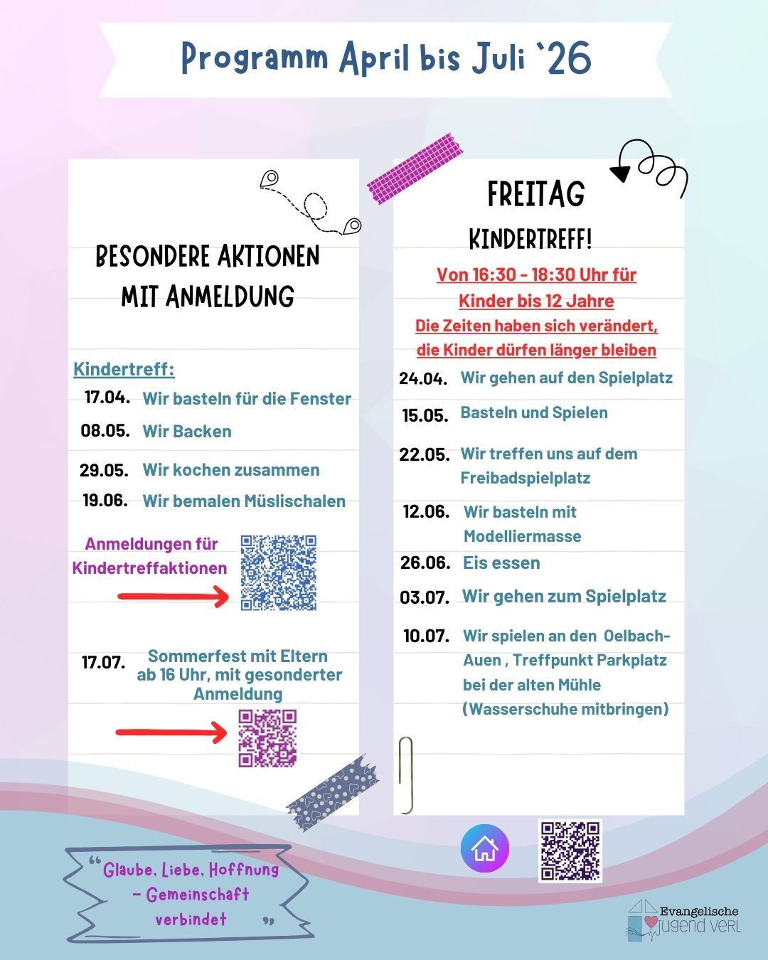 Wir singen, tanzen, spielen, toben, kochen, backen und erleben jede Woche neue Abenteuer. Unser Team bereitet immer ein tolles Programm für euch vor – Schaut gerne rein, Abwechslung garantiert! 🌟